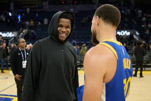 库里穿着爱德华兹的AE签名战靴,爱德华兹表示:“历史最佳库里(Curry the GOAT),那是我的兄弟。他不知道他其实和我是一体的,他的另一个灵魂就是我。”