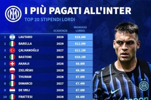 24直播网11月18日讯 根据德国转会市场统计,国米球员税前年薪榜单出炉。劳塔罗以1660万欧高居榜首,巴雷拉(1200万欧)和恰尔汗奥卢(1100万欧)分列二、三位。巴斯托尼(1020万欧)位列第四,阿坎吉(880万欧)紧随其后。这份排名清晰展示了球队核心球员的薪资结构。
