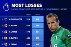 24直播网02月21日讯 德国转会市场统计了英超历史输球场次榜。门将施瓦泽以514场参赛200负位居榜首,中场巴里653场参赛198负位列第二。该榜单记录了球员在英超的失利场次,反映了他们长期的职业生涯。