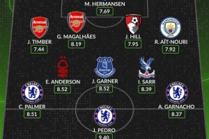 24直播网03月06日讯 Whoscored评出本轮英超最佳阵容。切尔西锋线三将帕尔默、佩德罗和加纳乔强势入选,成为最大亮点。此外,阿森纳的廷伯与加布里埃尔也入选后卫线,共同组成本轮最佳阵容。