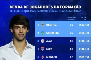 本世纪出售青训球员收入榜:本菲卡、葡萄牙体育、阿贾克斯前三
