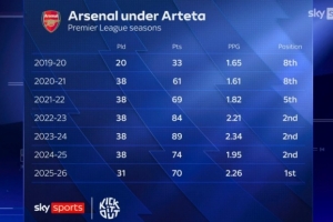 24直播网03月17日讯 天空体育统计显示,阿尔特塔执教阿森纳以来,英超场均积分呈上升趋势。23-24赛季以2.34分创下执教生涯新高,本赛季(25-26)2.26分次之,反映出球队竞技水平的稳步提升。