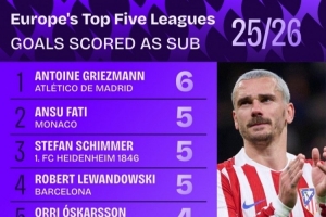 24直播网03月20日讯 马竞老将格列兹曼本赛季替补状态出色,以6球领跑五大联赛替补射手榜,展现高效得分能力。法蒂、莱万等球员紧随其后,均进5球。