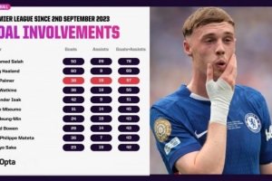 帕尔默为切尔西首秀以来英超参与57球,同期仅次萨拉赫和哈兰德