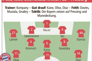 体育资讯11月22日讯 拜仁将在本轮德甲焦点战坐镇主场对阵弗赖堡,德媒《慕尼黑日报》也预测了拜仁首发。