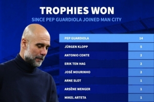 24直播网03月24日讯 自2016年执教曼城以来,瓜迪奥拉已率队赢得14座冠军奖杯,占同期英超俱乐部所获奖杯总数的39%。这一数量远超同期其他英超主帅,如克洛普的5座,彰显了其卓越的执教统治力。