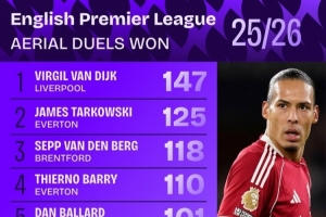 24直播网03月24日讯 根据Squawka统计,利物浦后卫范戴克以147次成功争顶领跑本赛季英超榜单,其75.77%的成功率在该争顶次数达100+的球员中为最高。埃弗顿的塔科夫斯基以125次位居次席。