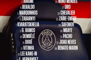 前锋:7-克瓦拉茨赫利亚、9-贡萨洛·拉莫斯、10-登贝莱、14-杜埃、49-姆巴耶