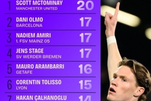 24直播网04月14日讯 根据Squawka数据,上赛季至今五大联赛中前卫进球榜中,麦克托米奈以20球位居榜首。奥尔莫、阿米里和斯塔格同以17球并列第二,毛罗·阿兰巴里以16球排名第五。