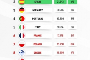 24直播网04月16日讯 欧冠8强战结束,拜仁淘汰皇马后,德甲欧战积分反超西甲,缩小了与西甲的差距。最新积分榜显示,英超以25.847分领跑,德甲以20.785分升至第三,仅次于西甲的21.343分。