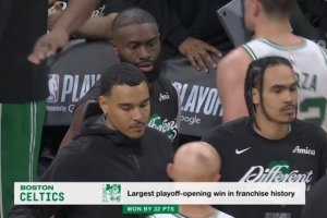 此役凯尔特人攻防两端压制对手,最终取得了32分的大胜,4节单节比分全部高于76人,也是队史季后赛揭幕战最大分差的胜利。
