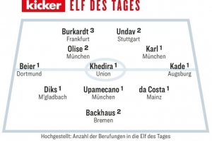 中场:拜尔(多特蒙德)、奥利塞(拜仁)、赫迪拉(柏林联合)、伦纳特·卡尔(拜仁)、卡德(奥格斯堡)