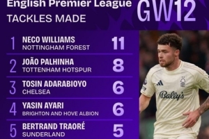 24直播网11月25日讯 利物浦0-3负于诺丁汉森林。后卫内科·威廉姆斯表现惊艳,单场完成11次成功抢断,创下诺丁汉森林队史英超单场抢断纪录,并刷新本赛季英超球员单场抢断数。