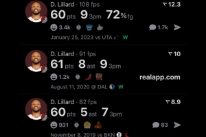 其中张伯伦第一多,他一共有32次,科比有过6次,而利拉德排名第三,他有过5次60+得分经历。
