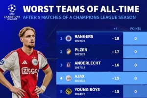 体育资讯11月26日讯 阿贾克斯在本轮欧冠不敌本菲卡,延续了本赛季至今的糟糕表现,《转会市场》统计显示他们也是欧冠历史前5轮同期战绩并列第4差。