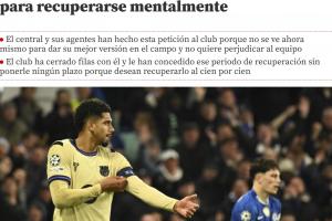 体育资讯12月01日讯 据《世界体育报》最新消息,在欧冠对阵切尔西时领到红牌之后,巴萨中卫阿劳霍向俱乐部申请了一段心理恢复假期。