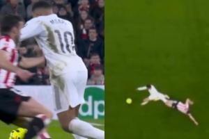 西甲第19轮,皇马3-0客胜毕尔巴鄂竞技,姆巴佩2射1传。其中第一球,姆巴佩接到阿诺德的长传,卸球转身摆脱左后卫莱奎、带球推进、弧顶变向过掉中卫拉波尔特、射门得分,这个过程一气呵成,莱奎防守姆巴佩时上手拉、下脚铲都没拦住!