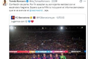 而阿斯报副主编,也是知名皇马球迷的龙赛罗在社媒转发了巴萨官方的这则动态,并表示:“当事人自己招供了,终于承认了内格雷拉丑闻那令人脸红的事实。希望皇马把这事写进即将发给FIFA的那份“毁灭性报告”里面。呵呵。”