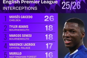 24直播网11月11日讯 英超联赛11轮战罢,拦截榜数据公布。切尔西球员凯塞多以26次拦截高居榜首,优势明显。伯恩茅斯的亚当斯与塞内斯并列第二,均有18次。水晶宫的拉克鲁瓦和诺丁汉森林的穆里紧随其后,均完成16次拦截。
