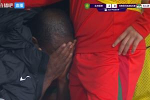 情绪崩溃!阿奇姆彭被换下后坐在替补席捂脸痛哭,队友不停安慰。