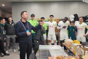 足协杯决赛赛前,北京国安足球俱乐部董事长周金辉来到球队更衣室,为球队送上鼓励。