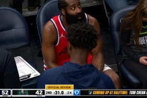 GIF-哈登三分被戈贝尔垫脚,裁判吹罚后者一级恶意犯规