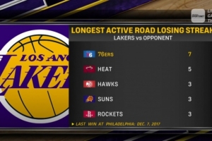 湖人上一次在费城赢球还要追溯到2017年12月7日。