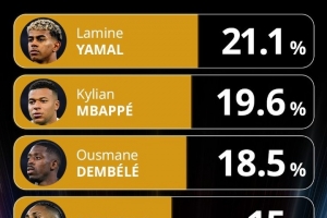 体育资讯12月12日讯 环球足球奖公布了年度最佳前锋的投票情况,亚马尔21.1%领跑。
