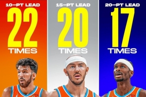 恐怖统治力!雷霆25场比赛中已17次领先对手20+&15次领先15+