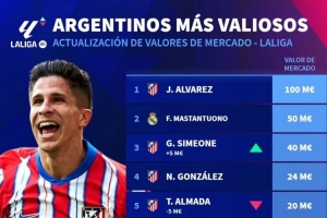 24直播网12月13日讯 德国转会市场更新了西甲阿根廷球员身价。马竞前锋阿尔瓦雷斯以1亿欧身价高居榜首,皇马的马斯坦托诺以5000万欧位列次席。朱利亚诺·西蒙尼(4000万欧)和冈萨雷斯(2400万欧)分列三、四位,其余球员身价在800万至2000万欧之间。