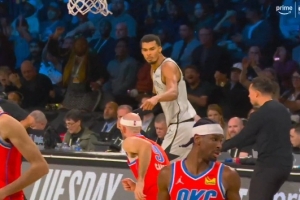 GIF-文班亚马面对卡鲁索干扰打进中距离 然后回头手指着对手振振有词