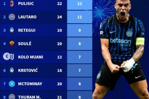 24直播网12月16日讯 德转统计2025年意甲球员客场进球榜。普利西奇以22场12球高居榜首,劳塔罗24场11球紧随其后。雷特吉效率惊人,10场9球排名第三。苏莱、穆阿尼等球员也跻身榜单前列。