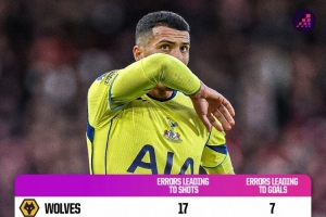 英超因失误丢球数统计:狼队以7球高居榜首,热刺、桑德兰及诺丁汉森林同以5球并列次席。