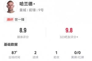 24直播网12月21日讯 曼城球星哈兰德在对阵西汉姆联的英超比赛中发挥出色,首发踢满全场,贡献2球1助攻,7次射门3次射正,并获评8.9分的高分,帮助球队取胜。