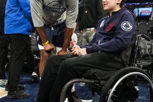 快船官方赛后晒出哈登与中国留学生约翰·郝拥抱的照片,并配文:感谢哈登的幸运符!