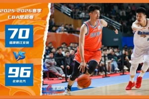 2025-2026赛季CBA常规赛第7轮焦点战在祖昌体育馆打响,福建晋江文旅男篮坐镇主场迎战开局六战全胜的北京北汽男篮。尽管主队首节打出惊艳表现,限制北京北汽男篮单节仅得9分,并领先8分进入第二节,但第二、第三节主队未能顶住对手的强势反扑,最终以70-96不敌北京北汽男篮,未能延续上轮击败广州的胜势。四节比分分别是:17-9,10-31,20-31,23-25(福建晋江文旅男篮在前)。