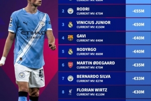 今年球员身价下跌榜:福登跌6000万欧居首,罗德里跌5500万欧次之