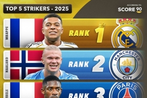 Score90评2025锋线最佳:前锋姆巴佩,左边锋拉菲,右边锋亚马尔