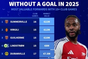 体育资讯1月4日讯 2025年已经过去,多位知名前锋一整年均未能取得进球,《转会市场》也统计了在俱乐部出场15+但0进球的球员身价榜。