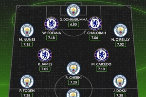 数据网站Whoscored也评选出两队本赛季英超评分最高阵容,曼城7人入选。具体如下: