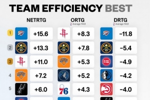 24直播网11月14日讯 美媒Basketball University发布最新赛季数据。雷霆以净效率+15.6高居榜首,同时防守效率-11.8同样位列第一。火箭则以进攻效率+8.3排名进攻端第一。掘金在净效率和进攻效率分列第二,防守效率排名第二。