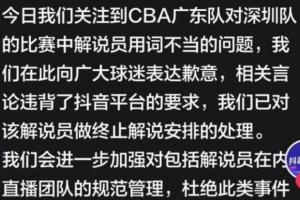 抖音体育官方随后发文致歉:今日我们关注到CBA广东队对深圳队的比赛中解说员用词不当的问题,我们在此向广大球迷表达歉意,相关言论违背了抖音平台的要求,我们已对该解说员做终止解说安排的处理。我们会进一步加强对包括解说员在内直播团队的规范管理,杜绝此类事件再次发生,不断提升赛事转播的质量,为球迷带来更好的服务和体验。