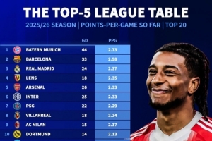 体育资讯1月9日讯 《转会市场》统计了本赛季五大联赛球队场均拿分情况,拜仁、巴萨、皇马分列前三。