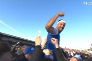 比赛结束后,麦克尔斯菲尔德球迷将球队进球功臣保罗·道森扛在肩上