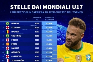 曾参加U17世界杯球员身价榜:内马尔1.8亿欧居首,斯特林次席