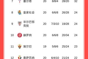 西甲积分榜完整形势如图所示:
