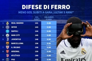 近5年五大联赛场均失球最少榜:皇马居首,国米、那不勒斯前三