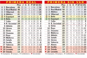 体育资讯1月20日讯 《阿斯报》统计了“如果没有VAR”的西甲积分榜情况,巴萨将增加1分、皇马将增加2分,两队将同积50分。