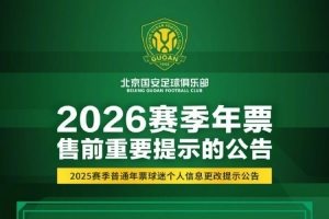 下一篇: 国安俱乐部宣布,年票销售工作将于春节假期后正式启动,并已发布相关售前提示公告。
