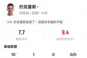 体育资讯1月21日讯 欧冠联赛阶段第7轮,阿森纳客场3-1战胜国际米兰。约克雷斯替补出战,2次射门1次射正打进1粒进球,评分7.7。
